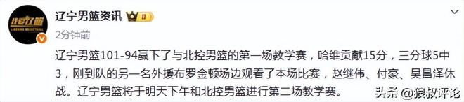 根据辽宁博主的报道,辽宁男篮101-94赢下了与北控男篮的第一场教学赛,哈维贡献15分,三分球5中3,刚到队的另一名外援布罗金顿场边观看了本场比赛,赵继伟、付豪、吴昌泽休战。辽宁男篮将于明天下午和北控男篮进行第二场教学赛。