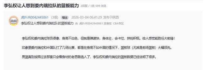 球迷们更是分析了李弘权现象,希望中国队员甚至所有CBA球员能从李弘权身上学点什么。球迷分析道:李弘权和委内瑞拉球员很像,身高不出色,但就是弹速快,身体壮,会卡位,拼抢积极。给人感觉能胜任大前锋!印象里委内瑞拉和中国队打了几场比赛,都是在身高不如中国的情况下,篮板球(尤其是前场篮板)大幅领先。男篮真别按照过去那套只会看身材的老思路选人了,李弘权和委内瑞拉的篮板数据已经说明了很多。